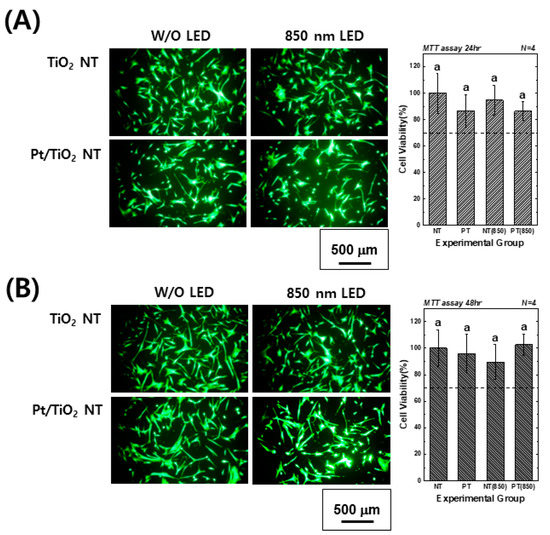 Figure 4 presents images of calcein-AM and EthD-1-stained hMSCs cultured on TiO2 and Pt-TiO2 NT, along with MTT assay results, with and without 850 nm NIR light irradiation. The images showed no evidence of damaged or dead cells (indicated by red fluorescence) in any of the groups after 24 and 48 h of cultivation. Moreover, the elongation ratio of the filopodia of hMSCs cultured on Pt-TiO2 NT specimen with 850 nm NIR light irradiation was higher than those of the other groups. The MTT assay results indicated no significant differences among all experimental groups (p > 0.05), and the cell viability values of all groups were above 70% compared to the control group (hMSCs cultured on cell culture dish), indicating good biocompatibility in all experimental groups.