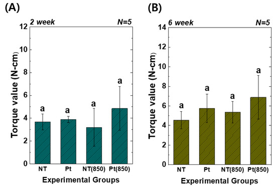 Torque test results of TiO2 NT- and Pt-TiO2 NT-treated implants after (A) two and (B) six weeks of implantation (In each graph, the experimental groups with different letters indicate statistical significance by one-way ANOVA at α = 0.05).