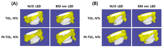 Figure 8 depicts the 3D micro-CT images of TiO2 NT and Pt-TiO2 NT with and without 850 nm NIR light irradiation. Following two and six weeks of implantation, widespread bone formation (yellow color in Figure 8) was observed surrounding the TiO2 NT or Pt-TiO2 NT surface-treated implant (white color in Figure 8), and the periosteum was elevated. Figure 9 presents the findings of the 3D micro-CT analysis, indicating a tendency for an increase in bone volume with 850 nm NIR irradiation. However, no statistically significant difference was observed depending on light irradiation (p > 0.05).