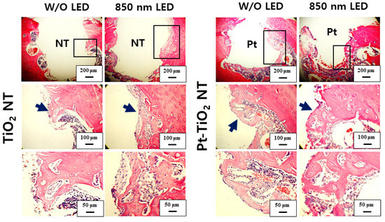 H&E-stained images of the tissues around the TiO2 NT- and Pt-TiO2 NT-treated implants after six weeks.