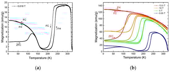 The data of the isofield dependence of the magnetization show that the sensitivity of the material to the magnetic field was kMs = 8.9 K/T (Figure 1b), that is., an applied external magnetic field of 1 T, shifts the temperature of the metamagnetostructural transformation by 8.9 K toward lower temperatures. Isofield dependence 1–3 T in [13].
