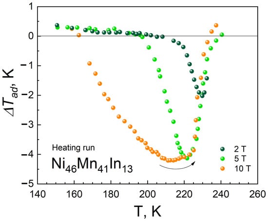 Figure 2 shows the dependences of the magnetocaloric effect ∆Tad on temperature in magnetic fields of 2, 5, and 10 T. It can be seen that, in the temperature range below 160 K, a slight conventional magnetocaloric effect is observed in the region of magnetic frustration in the martensite phase. In the temperature range of 160–240 K, in the region of the metamagnetostructural phase transition martensite–austenite, an inverse magnetocaloric effect appears, and in the temperature range of the existence of ferromagnetic austenite, a positive increase in temperature, that is, a conventional magnetocaloric effect. It should be noted that an increase in the applied magnetic field causes a shift in the maximum values of the MCE to the low-temperature martensite phase. The obtained dependence is consistent with the data of direct measurements of the magnetocaloric effect in Heusler alloys of the Ni-Mn-In system [15,16,17,18,19,20,21,22,23]. Namely, in [24], the maximum value of the magnetocaloric effect was obtained equal to ∆Tad = −5.5 K at a temperature T = 219 K in a magnetic field of 8 T, versus ∆Tad = −4.2 K at a temperature T = 212 K in a magnetic field of 10 T obtained in our article. In a magnetic field of 5 T, the authors obtained a value of ∆Tad = −4.8 K at a temperature of T = 224 K, against ∆Tad = −4.1 K at a temperature of T = 222 K obtained by us.
