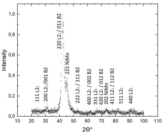 Work on the study of order–disorder transitions in alloys based on Heusler Ni–Mn–In showed that, for example, in Ni45Co5Mn50−xInx, the transformation temperature B2→L21 is approximately 896 K [8,9] and the portion of the L21 phase increases with cooling. This means that the structural order present at room temperature depends on the cooling conditions, in particular on the rate [10].