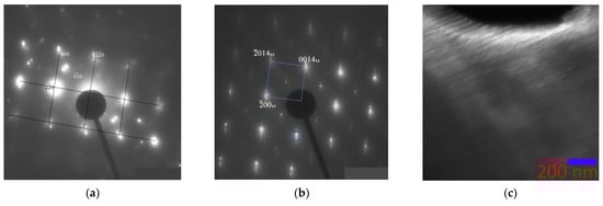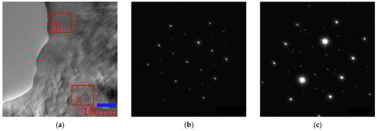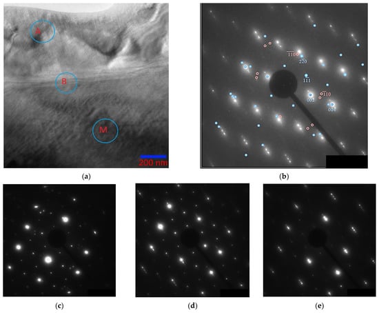 Electron diffraction patterns belonging to the austenite region, the martensite region, and directly to the interface were obtained (indicated in Figure 12a). Figure 12b brings together two sets of reflections; reflections from the electron diffraction pattern of austenite with zone axis [110]L21 are superimposed on the electron diffraction pattern obtained from the martensite region. It can be seen from the combined austenite–martensite diffraction patterns that, as the transformation progresses, all reflections of the L21 phase (reflections of the (220), (002), (004), and (224) types), except for the superstructural ones (111), split in the direction of one of the two diffuse scattering strands near reflections of the (004), (224), and (444) types. In this case, the corresponding planes of the L21 phase transform into the planes of martensite. The appearance of extra reflections on the electron diffraction patterns, at distances that are 1/7 of the distance between the main structural reflections, characterizes the martensitic phase as a modulated 14 M, and the martensitic transformation occurs according to the L21 → 14 M type, which is consistent with the findings of other authors [39,40,41]. Banding in bright-field images of martensite is perpendicular to the direction of the splitting of reflections in the electron diffraction patterns. For reflections belonging to the austenite phase, ordered according to type B2 (in Figure 12b, these reflections are of the (110) and (020) types with two satellites circled in red). When approaching the austenite–martensite interface, one of the three reflections first disappears, then they all vanish. This suggests that these reflections still belong to a phase with a different type of ordering, and not to secondary phases or oxides of manganese and nickel.