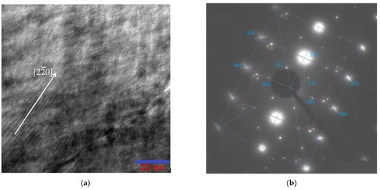 Bright-field (a) TEM image of the Ni46Mn41In13 alloy in the austenitic state at room temperature and the corresponding microelectron diffraction pattern (b) obtained from the entire area. The grating L21 is shown in blue, with the [110] zone axis.