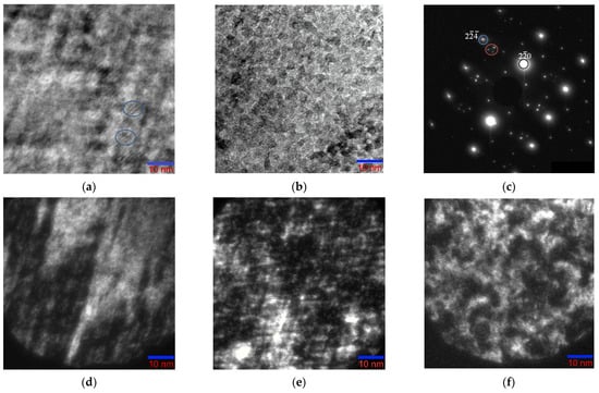Dark-field images obtained from the region in Figure 6a in the main lattice reflections of the L21 phase, which have diffused scattering strands, correspond to one (Figure 6d) or two (Figure 6e) sets of tweed contrast bands. The dark-field image in the triple reflection, which we associate with decay products, is a classical modulated structure resulting from stratification by the spinodal mechanism [33] (Figure 6f). The triplet of reflections in electron diffraction patterns (Figure 4c and Figure 5b) is made of the main reflection and two extra reflections, the origin of which is associated with “punctures” of the Ewald sphere by diffuse strands that do not belong to the given section of the reciprocal lattice. Intensity bands located obliquely to the diffraction plane are depicted on the electron diffraction patterns as satellites near the Bragg reflections.