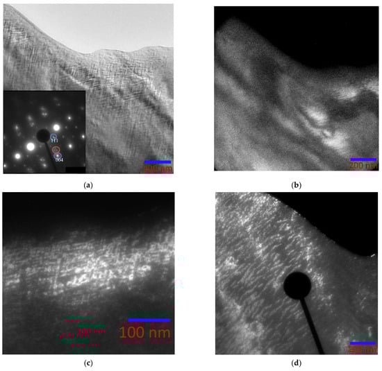 If a dark-field image is obtained in the (004)L21 reflection (Figure 8c), that is, in a reflection with diffuse scattering strands, then a contrast is observed from the APB separating the tweed domains. The dark-field image obtained in the triplet of reflections is shown in Figure 8d. The bright areas in the micrograph are periodic, evenly distributed curved strips in the form of “worms” 100–200 nm long. One can define this structure as a visualization of alternating domains of a partially ordered B2 phase and an ordered L21 phase. Figure 9 shows dark-field APB images obtained in various reflections from a region characterized by a tweed structure (the region is circled in blue in Figure 9a).