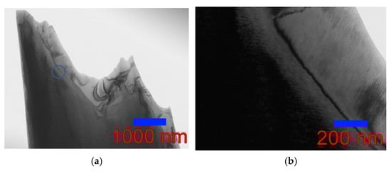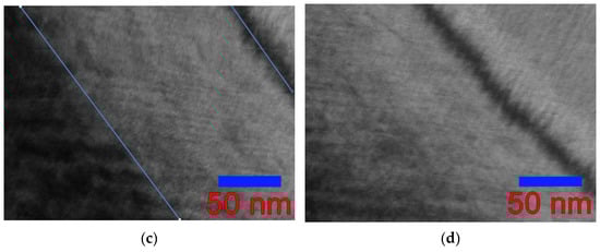The features of the fine structure of the wedge-shaped foil of the Ni46Mn41In13 alloy observed in this work showed that the martensitic transformation is blocked at a distance of about 600 nm from the edge of the sample at a plate thickness of less than 50 nm, where the formation of a martensitic structure does not occur even at liquid nitrogen temperature [13]. This size effect, shown in Figure 11a provided us with the opportunity to observe the austenite–martensite interface in the Ni46Mn41In13 alloy (Figure 11b,c). The boundary is not sharp and is a fairly wide transition layer ~150 nm wide. Such blurring indicates a high level of stresses, especially on the austenite side (Figure 11d). It can be seen how the banded contrast changes going from austenite (upper right corner) to martensite (lower left corner) through the transition layer. Of the two directions of the thin banded austenite contrast, only one direction remains with the same periodicity cane be seen at first, and then the distance between the bands increases, and a coarse black-and-white banded contrast is observed on the martensite side.