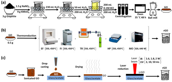 Schemes that illustrate the synthesis of graphene oxide and the reduction processes using thermal and laser methods are depicted in Figure 1a, Figure 1b and Figure 1c, respectively.