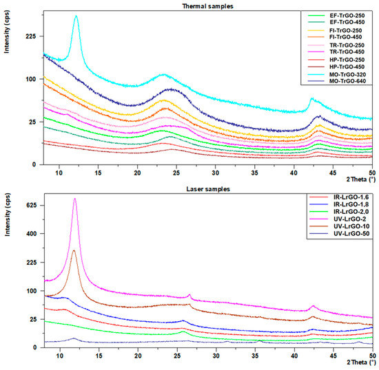 XRD peaks for the samples after the different thermal reduction treatments (top) and the samples after the different laser reduction treatments (bottom).