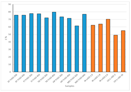 Elemental carbon analyses of the synthesized samples are shown in Figure 4. These results can be interpreted as another reduction degree measurement. The TrGO materials show a carbon concentration in the range of 60–80%. This range of values shows that there are no significant differences among the different procedures used for the thermal treatment in this work. From the two different parameters used, 250 °C and 450 °C, in the case of the EF-TrGO, FI-TrGO and HP-TrGO samples, there are no significant differences among the different procedures used. However, in the cases of the TR-TrGO and MO-TrGO samples, higher temperature conditions resulted in higher carbon content, showing a more effective reduction degree. MO-TrGO-320, UV-LrGO-2 and UV-LrGO-10 show lower carbon content (Figure 4), since part of the GO has not been reduced to rGO, as shown in Figure 3.