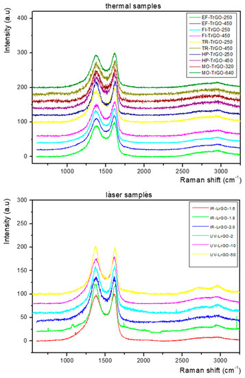 The synthesized materials were further investigated using Raman spectroscopy. Three Raman spectra acquired at different points for each rGO sample were analyzed and compared. All spectra acquired for each sample were similar, thus confirming the homogeneity of the samples. From Figure 5, it can be observed that comparable spectra were obtained from all the samples produced by the different thermal (Figure 5, top) and laser (Figure 5, bottom) reduction treatments. All samples show two strong bands located at ~1350 cm−1 and ~1590 cm−1, assigned to the D and G bands, respectively [51,52]. These two bands are greatly broadened with FWHM around 100 cm−1, resulting in their overlap. The broadening in the D band may be due to the disorder/defects in the samples, but the broadening in the G band is unusual.