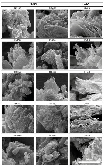 SEM microscopy was employed for morphological characterization. Most of the SEM images exhibit a well-expanded and exfoliated material with a porous structure (Figure 6). A quick release of gases generated during reduction treatments was observed for all treatments applied to the samples, causing not only reduction but also expansion and exfoliation, which could be a reason for their high SSA. This phenomenon was previously observed by other authors [14]. In this work, in both types of methods used to produce the samples, the expansion produced in the fabricated materials causes a similar morphology. A light material made up of separate and visible sheets corresponding to graphene is observed in both the TrGO and LrGO samples.