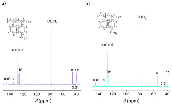 (a) 13C NMR spectrum of poly(S-co-CMS), 1. (b) 13C NMR spectrum of poly(S-co-AMS), 2. Note the clear shift in the position of the peak corresponding to the methylene carbon (denoted as a) during the replacement of all –Cl groups with –N3 moieties.