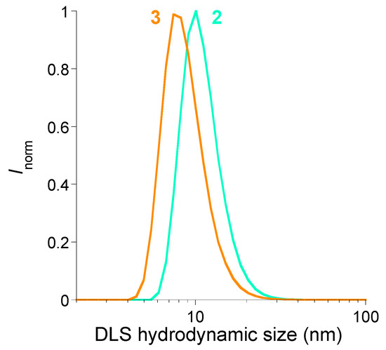 Metal-free PS-SCNPs were synthesized at r.t. via SPAAC using DIBOD molecules as intra-chain cross-linkers, as depicted in Scheme 1. We used a slow addition technique, first introduced by Hawker et al. [48], in which a solution of the precursor (i.e., 2) was added at a low addition rate to a solution of the cross-linker (i.e., DIBOD). After the complete addition of 2 in ca. 12 h, the mixture remained (additionally) for 12 h under stirring to allow the SPAAC to go to completion. Then, an appropriate amount of BzA was added to end-cap any potential unreacted alkyne group, and the mixture was left under stirring for an additional 24 h. After concentrating the reaction mixture, 3 was obtained by precipitation in cold EtOH. Figure 5 shows the SEC/MALS traces of 2, 3 before precipitation after 48 h of reaction, and 3 after precipitation, drying, and re-dissolution. No change in the SEC trace of the PS-SCNPs, 3, was observed from the crude to the dried (and re-dissolved) samples. The PS-SCNPs, 3, exhibited values of Mw (MALS) = 195.8 kDa, Ð = 1.21, and Rh (VIS) = 6.9 nm. The increase in Mw observed was due to the incorporation of the intra-chain cross-linker DIBOD. The SEC results confirmed the successful formation of SCNPs with a hydrodynamic size (Rh (VIS) = 6.9 nm) smaller than that of the precursor copolymer (Rh (VIS) = 9.2 nm). We can exclude the presence of multi-chain aggregates since the SEC/MALS technique is highly sensitive to their presence, and they should be observed at a low SEC retention time (<7 min.). Additionally, dynamic light scattering (DLS) measurements also showed a significant reduction in size (Rh (DLS) = 7.5 nm) upon the formation of metal-free PS-SCNPs via SPAAC using DIBOD molecules as intra-chain cross-linkers, as shown in Figure 6.