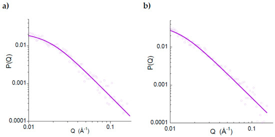 SAXS form factor of: (a) 3 after 2 months of storage in THF solution (Rg = 8.7 nm, ν = 0.46), and (b) 3 after 2 months of storage in the solid state (Rg = 12.0 nm, ν = 0.47).