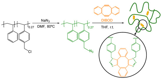 Styrene (S, ≥99%), sodium azide (NaN3, ≥99%), N,N-dimethylformamide (DMF, ≥99.9%), and 1,1′-azobis(cyclohexanecarbonitrile) (ACHN, ≥98%) were purchased from Sigma-Aldrich (Madrid, Spain). Chloromethyl styrene (CMS, ≥90%) and sym-dibenzo-1,5-cyclooctadiene-3,7-diyne (DIBOD, > 98%) were supplied by TCI. Tetrahydrofuran (THF, GPC grade) and methanol (MeOH, analytical grade) were purchased from Scharlau (Barcelona, Spain). Benzyl azide (BzA, 94%), S-cyanomethyl-S-dodecyltrithiocarbonate (CDTC, ≥97%), and ethanol (EtOH, 96% v/v) were supplied by Thermo Scientific (Eindhoven, Netherlands), Strem (Bischheim, France), and PanReac AppliChem (Barcelona, Spain), respectively. Unless otherwise specified, all reagents were used as received without further purification. To remove the inhibitor, S and CMS were purified by being passed through a column packed with activated basic alumina.