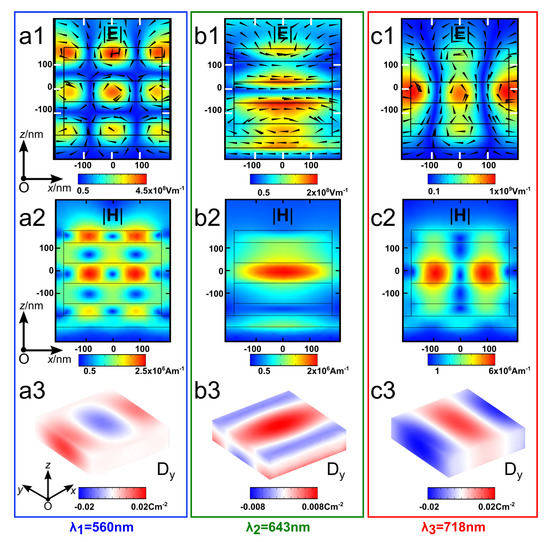 Electric field norm (|E|) distribution in the xOz plane (a1–c1), magnetic field norm (|H|) distribution (a2–c2), and 3D views of the electric displacement field, y direction () in the center layer of the cavity (a3–c3), for the three characteristic resonances nm (first column), nm (second column) and nm (third column). Arrows in (a1–c1) denote corresponding magnetic field vectors.
