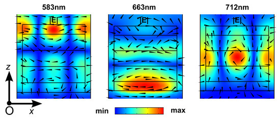 2D color maps (xOz plane) of electric field norm (|E|) distribution for resonances in metamaterial without a spacer (Figure 3 (iii)). The arrows denote corresponding magnetic field vectors.