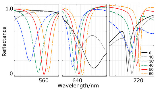 The polarization dependence is also explored in this study, and the results are shown in Figure A2. Due to the symmetries of both the resonator’s geometry and its array arrangement in xOy plane, the reflectance spectra are identical when TE illumination rotates 30°, 45°, and 60° in this plane.