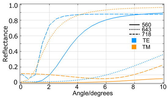 (Reflectance at = 560 nm (solid lines), = 643 nm (dotted lines), and = 718 nm (dashed lines) with incident angle varying from to . Different colors distinguish TE (blue) and TM (orange) incidence.