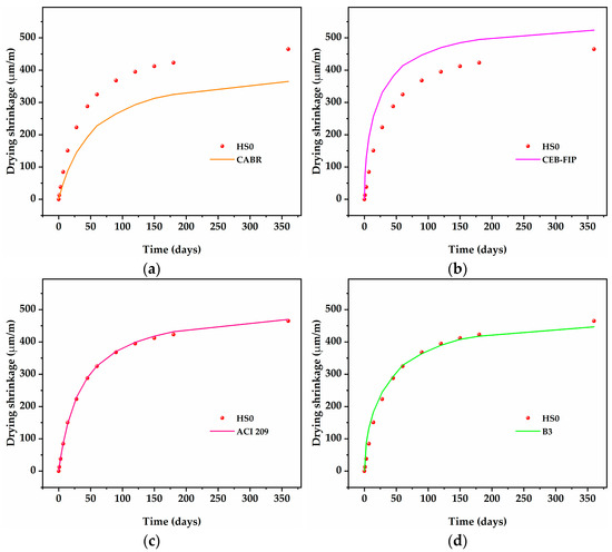As shown in Figure 7d, the B3 model deviated from the measured value in stage 1 and then gradually approached the measured value in stage 2. In general, the B3 model provided a better approximation of the measured values than the CABR model and CEB-FIP model in this study. The HSLWC in this study satisfied the constraints of the B3 model: water–cement ratio in the range of 0.30–0.85, cement content in the range of 160–720 kg/m3, and 28-day compressive strength in the range of 18–70 MPa.