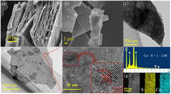 The morphology of bulk-CoS and EF-CoS was observed by typical SEM images in Figure 2a,b. In comparison with pristine bulk CoS in Figure 2a exhibiting the large lateral size and thicker structure of 50 μm, the CoS after 30 min of electrochemical exfoliation in Figure 2b has a smaller lateral size of 5–20 μm and a significantly thinner sheet, indicating that the bulk CoS particles are essentially fragmented and efficiently exfoliated. The relatively thin and thicker flakes of the samples can be easily distinguished by their different contrast using TEM, as shown in the low magnification TEM images of EF-CoS in Figure 2d. The contrast of EF-CoS with a transverse dimension of about 1 μm is significantly weaker than bulk-CoS of Figure 2c corroborating the lesser number of layers in the exfoliated sample. The high resolution TEM (HRTEM) image of Figure 2e exhibits clear lattice fringes with a crystal spacing of 3.06 Å. The EDS elemental scanning of Figure 2f taken on the nanosheets evidences the molar ratio of Co to S is close to 1:1, and the EDS elemental mapping image shows uniform distribution of Co and S elements in EF-CoS. In brief, the above results indicate that the obtained EF-CoS nanosheets have few defects and high crystallinity with intrinsic structure [23].