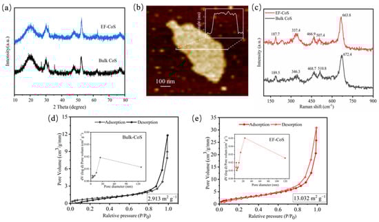 (a) XRD patterns comparison of bulk-CoS and EF-CoS; (b) AFM image of the topography of EF-CoS and corresponding height profile; (c) Raman spectra of AFM image of bulk-CoS and EF-CoS; (d,e) Nitrogen adsorption–desorption isotherms and cumulative pore volume of bulk-CoS and EF-CoS.