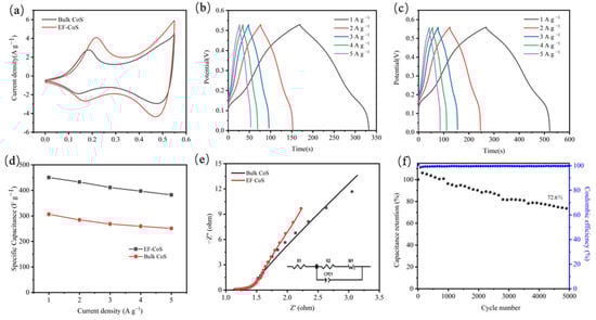 The significantly higher peak current density of EF-CoS than bulk-CoS implies a more intense redox process on the electrode. Additionally, a bigger closed area under the CV curves of EF-CoS suggests greater charge storage capacity than bulk-CoS electrodes, which probably related to the fluffier structure and larger specific surface area after electrochemical exfoliation. Figure 4b,c present GCD curves of bulk-CoS and EF-CoS electrodes at different current densities, respectively. The identification of nonlinear charge–discharge curves further confirms that Faraday behavior is consistent with the CV measurements. The curves in both plots are remarkably symmetric when used to all current densities, demonstrating it is favorable reversibility for the Faraday redox reaction [27,28]. Furthermore, the resulting discharge curve is processed with Equation (3) to calculate the specific capacitance. Due to the remarkable increase in the discharge time of EF-CoS compared to bulk CoS, the capacitance enlarged from the original 307 F∙g−1 to 450 F∙g−1 at the current density of 1 A∙g−1, which unambiguously proves the electrochemically exfoliated EF-CoS electrodes offered larger capacity and superior charging and discharging performance. This is mainly caused by the fact that the active sites of sheet-like metal sulfides mainly exist at the edge positions, and the electrochemical exfoliation process can expose more sheets and more active sites, which is agreeable with the HRTEM outcomes discussed earlier. Furthermore, the rate performance (specific capacitance vs. current density) of EF-CoS and bulk-CoS under various current densities is summarized in Figure 4d. EF-CoS delivers high capacitance of 450, 433, 411, 397 and 382 F∙g−1 under the current densities of 1, 2, 3, 4 and 5 A∙g−1, respectively. In contrast, the capacitances of the EF-CoS electrodes used for comparison are 307, 285, 268, 260 and 251 F∙g−1 under the same current densities. It is found that with 5 times higher current densities, the obtained EF-CoS electrode maintains 84.7% capacitance while bulk-CoS maintained 81.9%, demonstrating that the exfoliated samples exhibit higher capacitance as well as a substantially improved rate capability property [29,30].