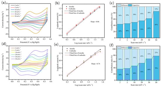 where a is a variable parameter and b is the slope of the curve. The b value of 0.5 represents that the reaction kinetics of the electrode is solely achieved by the diffusion-limited redox reaction, also known as battery type or pseudo-capacitance; the b value close to 1.0 denotes that the ideal capacitive behavior is mainly caused by the surface control process, also known as electrochemical double layer capacitance. Results from the peaks plot, the values of b for bulk-CoS and EF-CoS electrodes are 0.86 and 0.74, respectively, demonstrating that the capacitance of both electrodes derive from the mix of diffusion-controlled and surface-controlled capacitance process [39]. However, the b-value of EF-CoS electrodes decreases and is closer to 0.5, indicating that the charge storage process of EF-CoS tends to be dominated by more diffusion of the OH− process of the battery-like behavior, corroborating the more intense ion insertion and removal processes of the EF-CoS electrode. The capacitance contribution to the total capacity can be further quantified using the following equation: