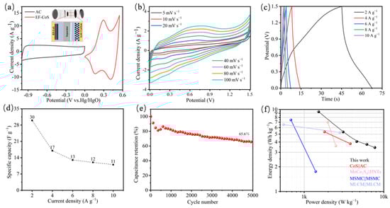 To further evaluate the potential of EF-CoS in practical applications, a BSH device (EF-CoS//AC) was assembled employing AC and 3 M KOH as anode materials and aqueous electrolytes, respectively, as shown in the inset of Figure 6a. The various voltage windows of EF-CoS cathode and AC anode in the three-electrode system can be observed by the CV curves in Figure 6a, from which the voltage windows of EF-CoS and AC are between −1.0–0 V and 0–0.55 V, respectively, showing that the BSH device should theoretically have a wide operating voltage of ~1.55 V. In order to obtain the appropriate voltage window for the assembled BSH, CV curves of the device were obtained in various voltage conditions range from 0–1.1 V to 0–1.7 V. As observed in Figure 5a, the total range is determined to be 0~1.5 V since it can be observed that the voltage window can remain stable under this condition. The CV curves of EF-CoS//AC device are illustrated in Figure 6b, whose similar CV curve shapes point to the excellent rate capability. Figure 6c presents GCD curves of a fabricated asymmetric supercapacitor under various current densities, from which could be calculated the specific capacitance of the EF-CoS//AC device decreases from 30, 17, 13, 12 to 11 F∙g−1 with the discharge current density aggrandizes from 2, 4, 6, 8 to 10 A∙g−1. Additionally, the stability of the EF-CoS//AC device was also obtained by charging the electrode with the current density of 3 A∙g−1, and it showed favorable cycling stability, maintaining 66% capacitance retention after 5000 cycles of charge and discharge, as demonstrated in Figure 6e. The Ragone plot, the corresponding power density and energy density of the as-assembled EF-CoS//AC device, can be found in Figure 6f. Based on Equations (4) and (5), the energy density of EF-CoS//AC hybrid device is 9.4 Wh∙kg−1 at the power density of 1520 W∙kg−1 and maintained at 3 Wh∙kg−1 even at 7550 W∙kg−1. These outperform some other cobalt-based BSH devices fabricated by CoS//AC (15.58 Wh∙kg−1 at 700.12 W∙kg−1) [34], CoS//AC (5.3 Wh∙kg−1 at 1800 W∙kg−1) [36], an MnCo2S4/HNTs symmetric device (6.98 Wh∙kg−1 at 1970.6 W∙kg−1) [42] and MSMC//MSMC device (7.41 Wh∙kg−1 at 160 W∙kg−1) [43].