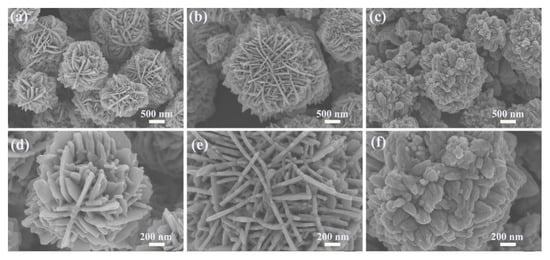 SEM images of ZnO nanosheet flowers assisted by different concentrations of malic acid: (a,d) 11 mmol; (b,e) 15 mmol; (c,f) 18 mmol.