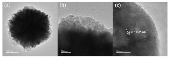 By changing the concentration of malic acid, we are able to control the crystal morphology of ZnO samples. From the SEM images of the above three ZnO samples, it can be seen that the morphology of ZnO changed with increasing malic acid concentration, where the ZnO sample prepared with 15 mmol malic acid perform the best 3D layered structure and complex mesh-like surface. Meanwhile, the nanostructure of ZnO was studied by TEM analysis. The TEM and HRRTEM of the ZnO samples prepared with 15 mmol malic acid are shown in Figure 4. The TEM image of a typical microsphere is shown in Figure 4a,b, showing the sheet-flower structure of ZnO. The fringe spacing of 0.28 nm is clearly observed in the HRTEM image (Figure 4c), corresponding well with the (100) lattice plane of the wurtzite ZnO (JCPDS Card No. 36-1451) [27].