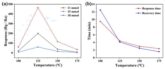 It is well known that the response value of semiconductor metal oxide type gas sensors is strongly influenced by the operating temperature and therefore it is necessary to find the optimum operating temperature for gas sensors. We fabricated sensors with ZnO samples prepared from 11 mmol, 15 mmol, and 18 mmol malic acid. In order to find the optimal operating temperature, the response values of different sensors to NO2 at different operating temperatures were tested, and this analysis was used to obtain the optimal sensor pieces. Different sensors were studied at four operating temperatures, including 100 °C, 125 °C, 150 °C, and 175 °C, as shown in Figure 5a. From the figure, it can be seen that the response value of all three sensors fabricated for NO2 increases with the increase in the operating temperature, and the response value is maximum when the operating temperature reaches 125 °C. Meanwhile, the gas-sensitive response value (466.7 to 5 ppm NO2) of the ZnO sensor prepared based on 15 mmol malic acid to NO2 is much higher than the other two sensors. After that, the response values of all three sensors decreased to different degrees with a further increase in operating temperature, probably this is because the increasing operating temperature provides energy to the nitrogen dioxide to overcome the hindrance of reaction with various types of oxygen, then the content of adsorbed oxygen will increase. However, when the operating temperature exceeded the temperature of 125 °C, the adsorbed NO2 starts to desorb faster, resulting in a decrease in the response value of the sensor [28,29]. The response time and recovery time are also important indicators for evaluating the gas sensor. We analyzed the response and recovery times of the devices with the best response to NO2, and it can be seen from Figure 5b that the response time and recovery time of the sensor decrease significantly with the increase in temperature. The main reason for this phenomenon may be due to the increase in the operating temperature which makes the adsorption and desorption of gases on the surface of the sensing material faster, resulting in shorter and shorter response and recovery times [30]. In practical applications, a fast response time and recovery time are necessary.