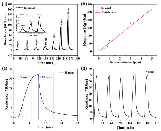 The response values of the three prepared devices to NO2 show that the ZnO gas sensor based on 15 mmol malic acid has the highest response value to NO2. Therefore, we continued the systematic testing of the device. Figure 6a shows the dynamic resistance curves of the sensor, exposed to different concentrations of NO2 at the optimal operating temperature. When the NO2 concentration increased from 0.1 ppm to 5 ppm, the response value also increased from 12.5 to 466.7. The sensor had a relatively high response value of 12.5 at 0.1 ppm NO2, which shows that the sensor has a low detection limit. In addition, it can be seen from the graph that the resistance value of the sensor increases linearly with the concentration of NO2, which indicates that the sensor also has good dynamic response characteristics. In addition, by fitting the response data of the sensor, the law of the response value with NO2 concentration can be analyzed, as shown in Figure 6b. The response value of the sensor increases linearly with the concentration of NO2. Figure 6c shows that the response time and recovery time are 480 s and 450 s to 1 ppm NO2. Additionally, repeatability is also one of the important indicators to evaluate the sensor performance. Figure 6d shows the repeatability of the sensor to 1 ppm NO2. From the graph, it can be reached that the response value to 1 ppm NO2 and the baseline resistance of the sensor is stable in five consecutive tests. The results show that the sensor has good characteristics of response/recovery and repeatability.