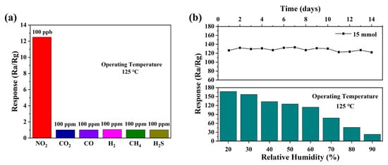 (a) The selectivity of sensor to 1 ppm NO2 and 100 ppm other gases at different temperatures, (b) long-term stability of the sensor at 125 °C for 1 ppm NO2 and response curve with relative humidity.