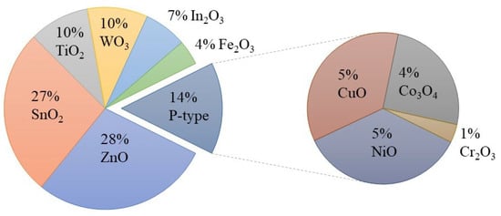 In this field, MOX gas sensors are gaining significant attention as they possess many desired properties for an ideal sensor. As shown in Figure 4, there have been numerous efforts to utilize different MOXs in gas-sensing applications. Among these MOXs, TiO2 has been extensively studied for various gas-sensing applications, including hydrogen (H2), carbon monoxide (CO), ethanol (C2H5OH), acetone (C3H6O), and ozone (O3), in recent years (Figure 5) [10,11,12]. This article will delve into the advances made in TiO2 for gas-sensing applications and provide a comprehensive evaluation of its gas-sensing properties. Additionally, the gas-sensing mechanisms and prospects for sustainable growth and gas-sensing applications of TiO2 will also be discussed at the end of the article.