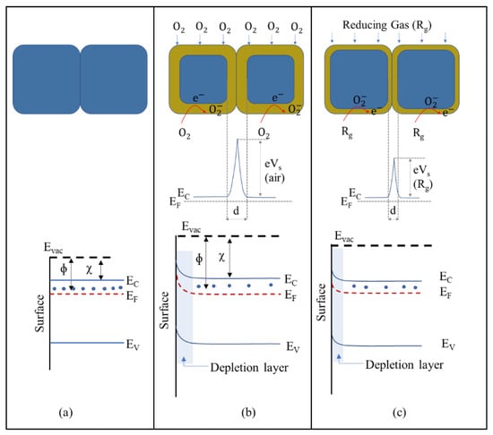 Energy-band diagram of a typical n-type MOX semiconductor: (a) flat band, (b) when an electron-depletion layer is formed due to chemisorption of oxygen molecules, and (c) when a reducing gas interacts with oxygen species.