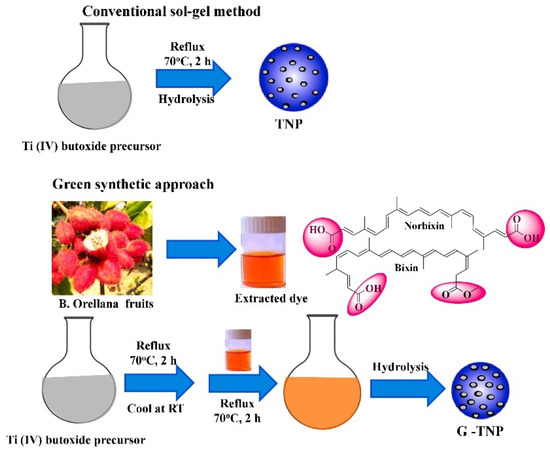 On the other hand, employment of a capping agent in the synthesis process reduces agglomeration, which results in a decrement in the average particle size. In this context, the use of bio-capping agents provides an eco-friendly, facile, and one-step synthesis of nanoparticles, which could be easily scaled up to industrial production at a lower cost. For example, Maurya et al. synthesized mesoporous anatase TiO2 nanoparticles using the sol–gel synthesis route from titanium (IV) butoxide solution with the help of a bio-capping agent [30]. Furthermore, non-toxic chemicals, such as deionized water, isopropanol, and glacial acetic acid, were used in this work. In Figure 10, the researchers illustrate a comparison of TiO2 that is prepared using the same procedures without and with the utilization of extract of bixa orellana seed. Bixa orellana seed extract contains cis-bixin, which can be readily converted to the more stable trans-bixin. The study findings indicated that the TiO2 nanoparticles that were prepared, both with and without the bio-capping agent, had a particle dimension of 16 and 13 nm, respectively. However, the crystal phase changed from a mixed phase of brookite and anatase to a pure anatase phase when the green synthesis method was employed.