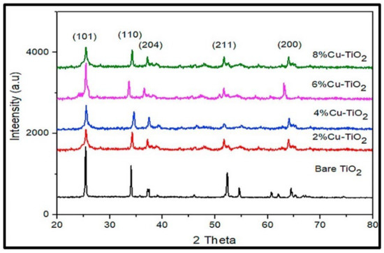 Comparative X-ray diffraction analysis of pure TiO2 and Cu-Doped TiO2 NPs at varying concentrations. Reprinted from [66].
