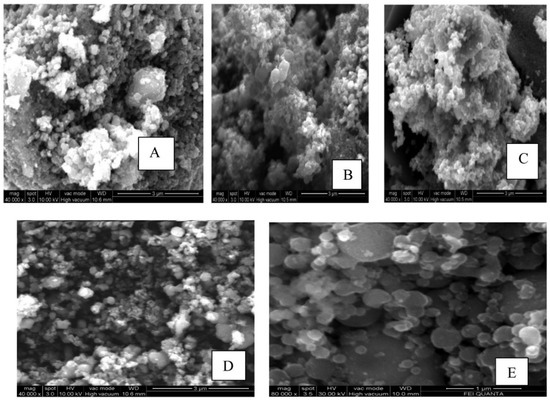 SEM images of (A) PB-TiO2, (B) OT-TiO2, (C) MO-TiO2, (D) CS-TiO2, and (E) TiO2. Reprinted from [67].