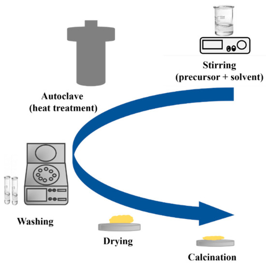 In recent years, hydrothermal synthesis is a method widely used to prepare various nanostructures of TiO2, such as quantum dots [72], nanowires (NWs) [73], nanotubes (NTs) [74], nanosheets (NSs) [75], and others. The hydrothermal method is divided into two categories based on the solvent solution used: acid-hydrothermal and alkali-hydrothermal methods. As shown in Figure 20, the process begins by mixing the precursor and solvent to form a homogeneous mixture. The mixture is then subjected to thermal treatment using a closed system in a Teflon autoclave under a specific pressure and temperature. The use of a closed system with controlled temperature and pressure offers a higher level of stability in the process. This stability leads to better control over the size of crystals, the initiation of nucleation, and the degree of crystallinity achieved [76]. The resulting product is then washed and dried, followed by crystallization through annealing at a specific temperature [77].