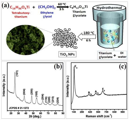 Synthesis and characterization of synthesized anatase TiO2 NPs: (a) synthesis scheme, (b) XRD, and (c) Raman spectrum of TiO2. Reprinted from [81].