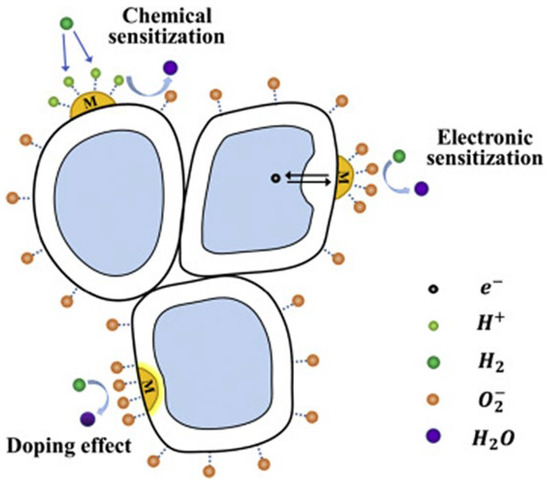 The ionosorption mechanism is widely recognized as the predominant model. This model relies on the modulation of the adsorption and desorption of oxygen species (O− and O2−) on the MOX surface. When exposed to atmospheric air, oxygen molecules are adsorbed onto the MOX surface through two methods: physisorption and chemisorption. Physisorption is driven by van der Waals forces, with no charge transfer occurring between MOXs and oxygen. In chemisorption, oxygen molecules are tightly bound to MOXs due to the transfer of charge between MOXs and oxygen molecules. This makes chemisorption the most crucial step in this gas-sensing mechanism.