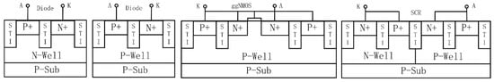 Traditional in-Si PN-based ESD protection structures (A = anode and K = cathode).