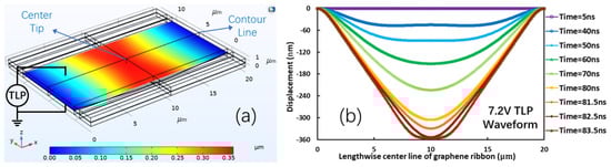 To understand the gNEMS ESD protection mechanism and guide gNEMS design, a finite element method (FEM)-based simulation was conducted. Figure 6 shows a gNEMS ESD device in an ESD-test setting using a transmission line pulse (TLP) ESD stress tester. The simulated gNEMS had a length of (L) = 20 µm, a width of (W) = 10 µm, and a cavity depth of d = 350 nm. Figure 6a shows the vertical physical displacement (Z-axis) of the graphene ribbon at the moment when the suspended graphene ribbon touched the bottom electrode. The vertical displacement of the graphene ribbon is scaled in colors, with blue for “0” displacement (i.e., the suspended graphene film in its original position) and red for the largest bending displacement at the center (−350 nm bending). The bending and contact of the graphene ribbon appear to be uniform across the ribbon width. Figure 6b depicts the simulated vertical displacement characteristics of the graphene ribbon in the time domain during the TLP stressing period under a square pulse waveform of 7.2 V. It is readily observed that the suspended graphene membrane has the largest bending at the center, and the physical displacement increases as the TLP pulse continues in the time domain until touching the bottom. The simulation shows that as the time elapses, the electrostatic force induced by the TLP pulse will pull down the graphene ribbon at the central part. Once the graphene ribbon starts to bend, the intrinsic elastic force appears in the graphene membrane. As the distance between the center of the graphene ribbon and the bottom of the cavity decreases, the TLP-induced electrical field force increases to pull down further, while the elastic recovery force in the graphene will also increase. Since the ESD-induced electrostatic force is much stronger than the elastic force, the suspended graphene ribbon will continue to bend until it touches the bottom electrode to turn the gNEMS switch ON for ESD protection. This simulation helps to optimize the gNEMS design for which the ESD-induced pull-down force and elastic recovery force are considered to ensure the gNEMS ESD switching function. After the TLP pulse is over, the ESD-induced electrostatic force will immediately disappear, and the intrinsic elastic force will dominate and pull up the bent graphene ribbon back to its original position, thus turning the gNEMS OFF [16].