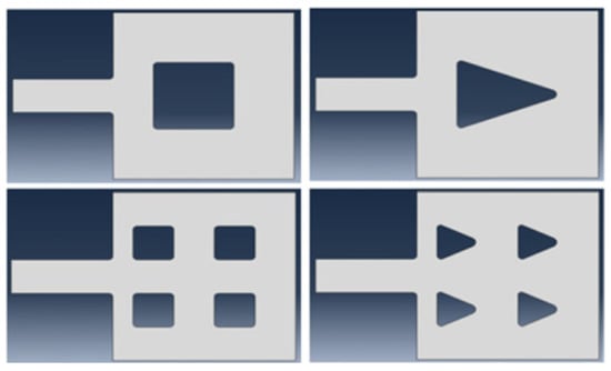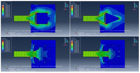 FEM simulation can also be used to investigate the stress effect of the suspended graphene ribbon in a gNEMS under ESD zapping and hence provide design guidelines for improving the mechanical reliability of gNEMS devices. As shown in Figure 4, the graphene ribbon was held by metal pads on both ends. During ESD actions, the ESD-induced electrostatic pull-down force creates stress on the graphene ribbon, particularly under the metal pads. In extreme cases, a physical fracture may occur, causing the mechanical failure of a gNEMS structure. To analyze the graphene fracture stress behaviors, various “nails” are designed to “hold” the graphene ribbon at the pad locations, as depicted in Figure 7 [17]. For a comparison study, four nail design splits were designed: a single square nail, a single triangular nail, and four square and triangular nails, which pin down the graphene ribbons with the pads. The idea for the nail design splits was that the nail shape affects the stress, and having more smaller nails may mitigate the stress effects. Figure 8 depicts the fracture stress maps generated through FEM simulation, with the mechanical stress intensity color-coded as blue to indicate the lowest and red to indicate the highest stress pressure. It is readily observed that a single nail induces much heavier stress over the four-nail cases. The single square nail tends to have more stress than its triangular nail counterpart. On the other hand, the case with the four triangular nails is subjected to the lowest stress. Table 1 summarizes the fracture stress results for the four nail designs.
