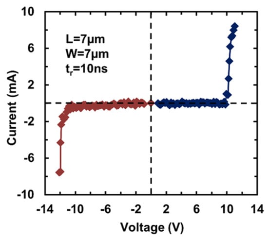 A transient ESD stress test was then conducted using a TLP tester featuring a rise time of 10 ns and a pulse width of 100 ns. Figure 10 depicts the measured ESD I–V characteristics for a sample gNEMS device (d = 350 nm, L = 7 μm, W = 5 μm) under both TLP stressing directions. The transient ESD behavior is clearly achieved. More importantly, the I–V characteristics of dual-directional ESD are observed for the gNEMS devices, which is a unique feature of this gNEMS ESD switch. The slight difference in the I–V curves in two opposite directions is attributed to the imperfection of the gNEMS prototype, as shown in Figure 4. TLP testing confirms that the gNEMS stays OFF until the TLP pulse increases to a certain high level, which will quickly trigger the gNEMS into a low-R discharging mode for ESD protection. Experimental results show that the ESD-triggering voltage (Vt1) can be adjusted by device design parameters, including cavity depth, as well as the width, length, and shapes of graphene ribbons. The measured leakage current is very low, ~3–13 pA. This gNEMS can handle very high ESD current of up to ~108 A/cm2, equivalent to ~1.5 KV/μm2, which is much higher than ~7.5 V/μm2 for an SCR ESD device (normally considered the most robust ESD protection devices in traditional PN-based structures). It is worth noting that gNEMS supports ESD in both directions, which can dramatically reduce the total ESD head count on a chip and thus significantly reduce the problem of ESD protection design overhead.