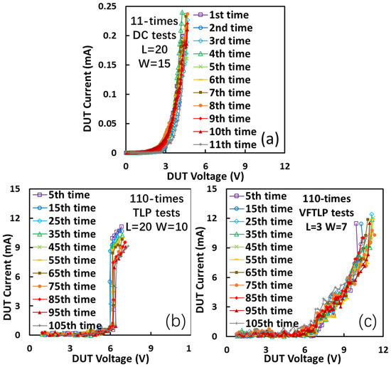 Repeated ESD stress tests for different single-crystalline gNEMS devices of varying sizes confirm that the gNEMS structures are extremely stable: (a) DC sweeping stress test repeated 11 times; (b) TLP zapping test repeated 110 times; (c) VFTLP zapping test repeated 110 times.