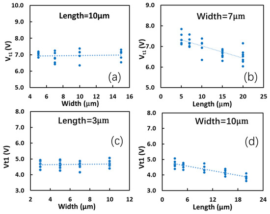 Statistical results for impacts of graphene ribbon dimensions on ESD Vt1 in tests: (a) Vt1~W at a fixed L is almost flat under TLP; (b) Vt1~L at a given W shows a monotonous trend under TLP; (c) Vt1~W at a fixed L is almost flat under VFTLP; and (d) Vt1~L for a given W shows a monotonous trend under VFTLP.
